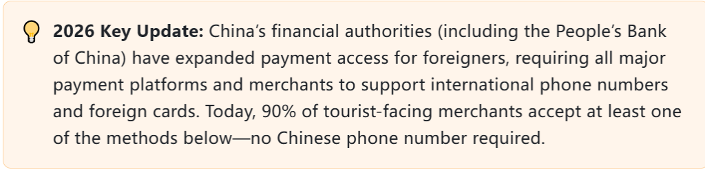 Yes! All 5 options above support foreign phone numbers (from 210+ countries/regions) in 2026. The PBOC has mandated that payment platforms eliminate the Chinese phone number requirement for international users, making it easier than ever to pay in China without a local SIM card.