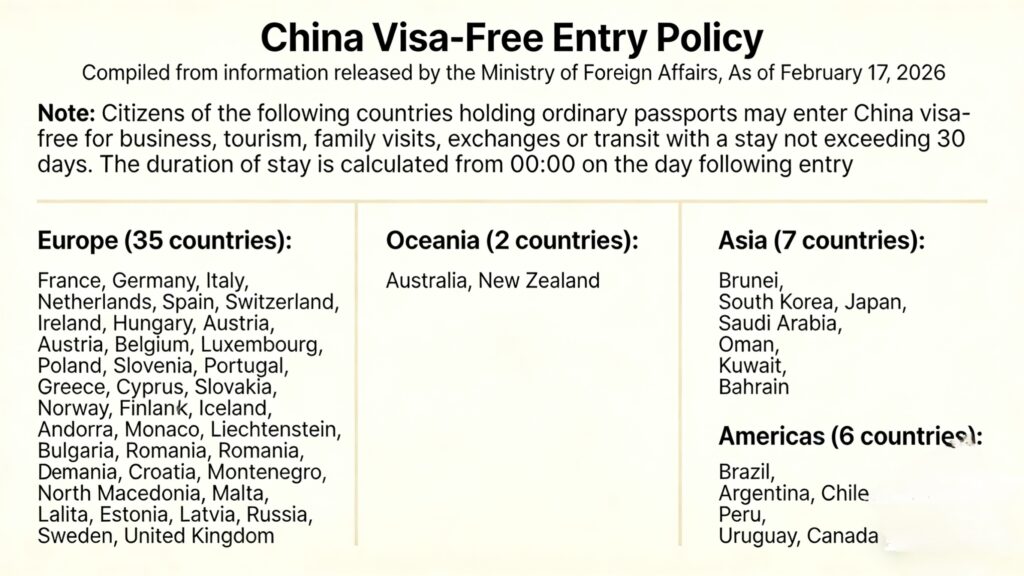 Good news for frequent travelers! As of February 17, 2026, citizens of 50 countries can visit China for tourism, business, or family visits without a visa for stays of up to 30 days.